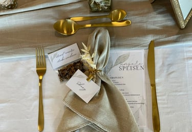 Wir bieten personalisierte Deko und goldenes Besteck für Ihre besonderen Anlässe und Veranstaltungen an.